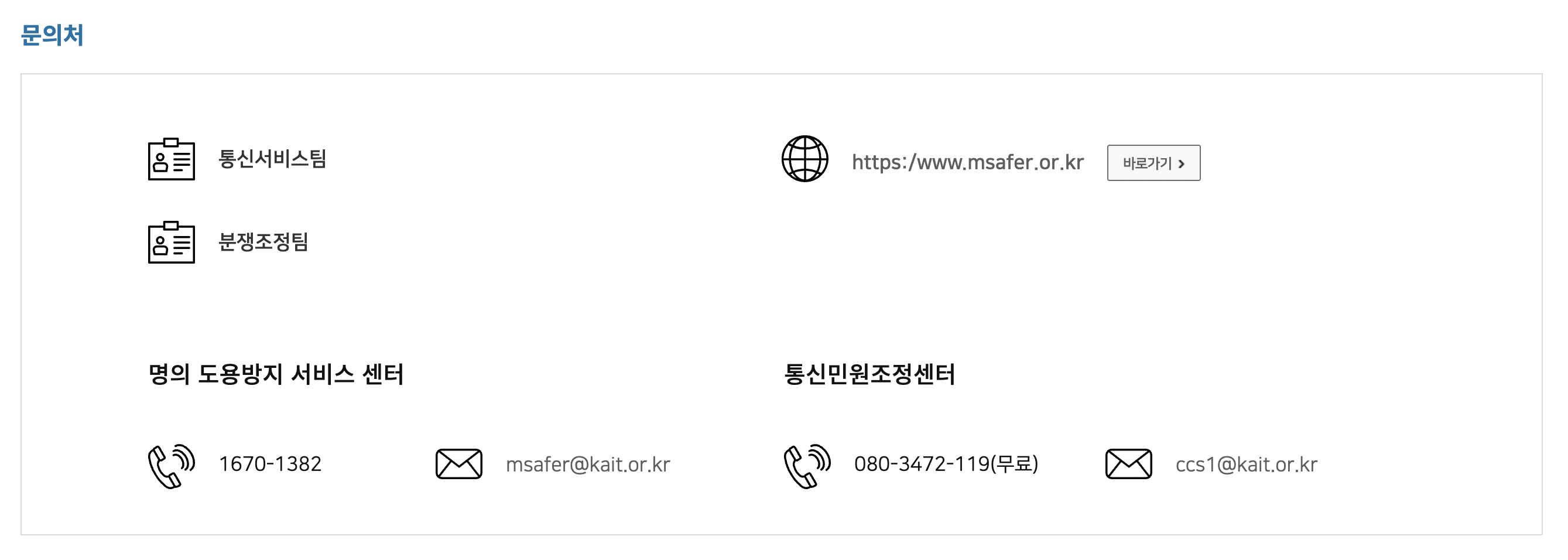 | 명의도용 상담센터 | ☎ 1670-1382 / ✉ msafer@kait.or.kr |