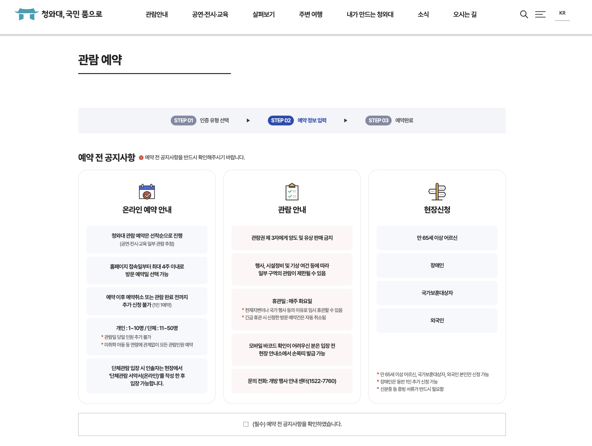 | 관람 예약 방식 | 청와대 국민개방 홈페이지에서 온라인 사전 예약 필수 |