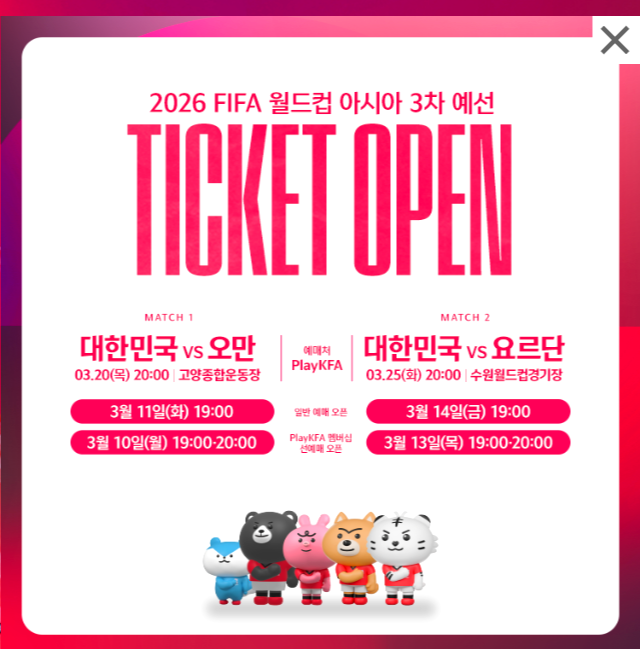 - 선예매: 3월 13일(목) 19:00-20:00 시작됩니다. 선예매는 PlayKFA 멤버십 팬들을 위한 기회로, 예매가 빠르게 마감될 수 있으니 서둘러 예매를 완료하시기 바랍니다.