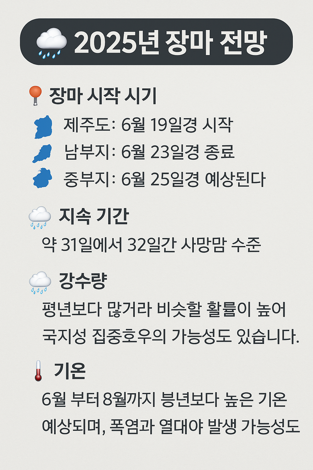 ☝️ 주의: 실제 장마 시작일은 기상 상황에 따라 며칠 앞당겨지거나 지연될 수 있습니다. 기상청 공식 예보를 수시로 확인하세요.